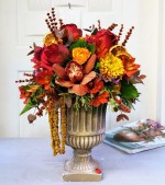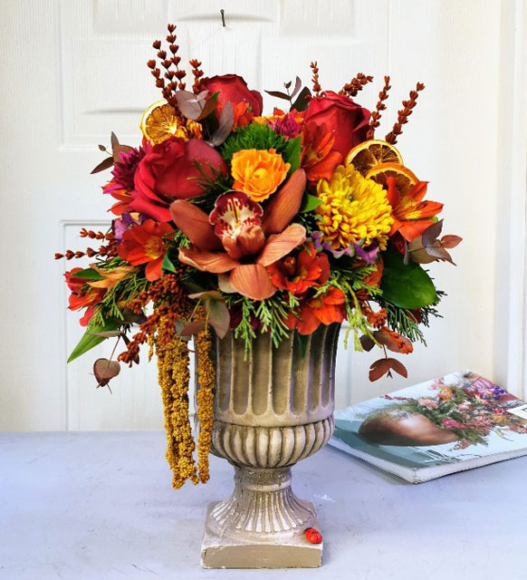 3 gül, cymbidium orkide, astemoria ve mevsim çiçekleri